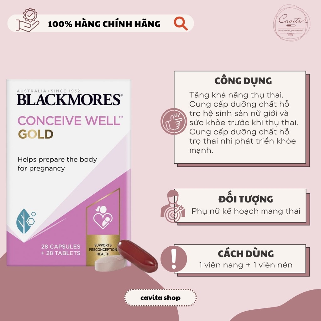 Viên uống Blackmores Conceive Well Gold của Úclà một nguồn cung cấp các chất dinh dưỡng cần thiết và quan trọng cho các bà mẹ trước giai đoạn mang thai, giúp các bà mẹ tương lai có một sự chuẩn bị đầy đủ và khỏe mạnh để bước vào thời kì mạng thai an toàn.