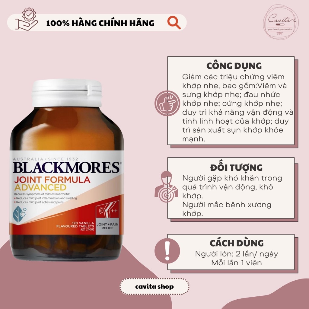 Blackmores Joint Formula Advanced là sự kết hợp của nhiều dưỡng chất có lợi cho sức khỏe xương khớp. Sản phẩm thuộc thương hiệu Blackmores – thương hiệu hàng đầu ngành sản xuất dược phẩm và thực phẩm chức năng với hơn 85 năm hoạt động.