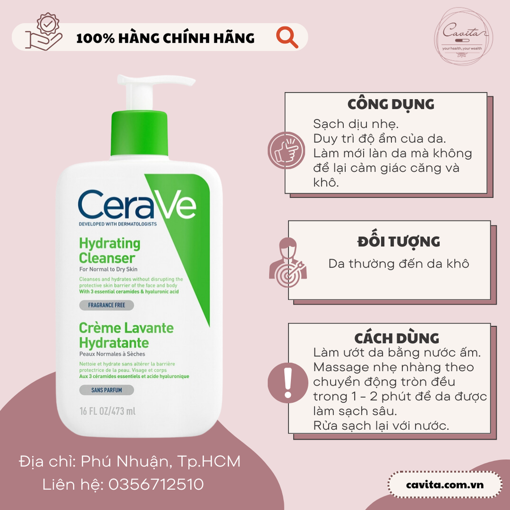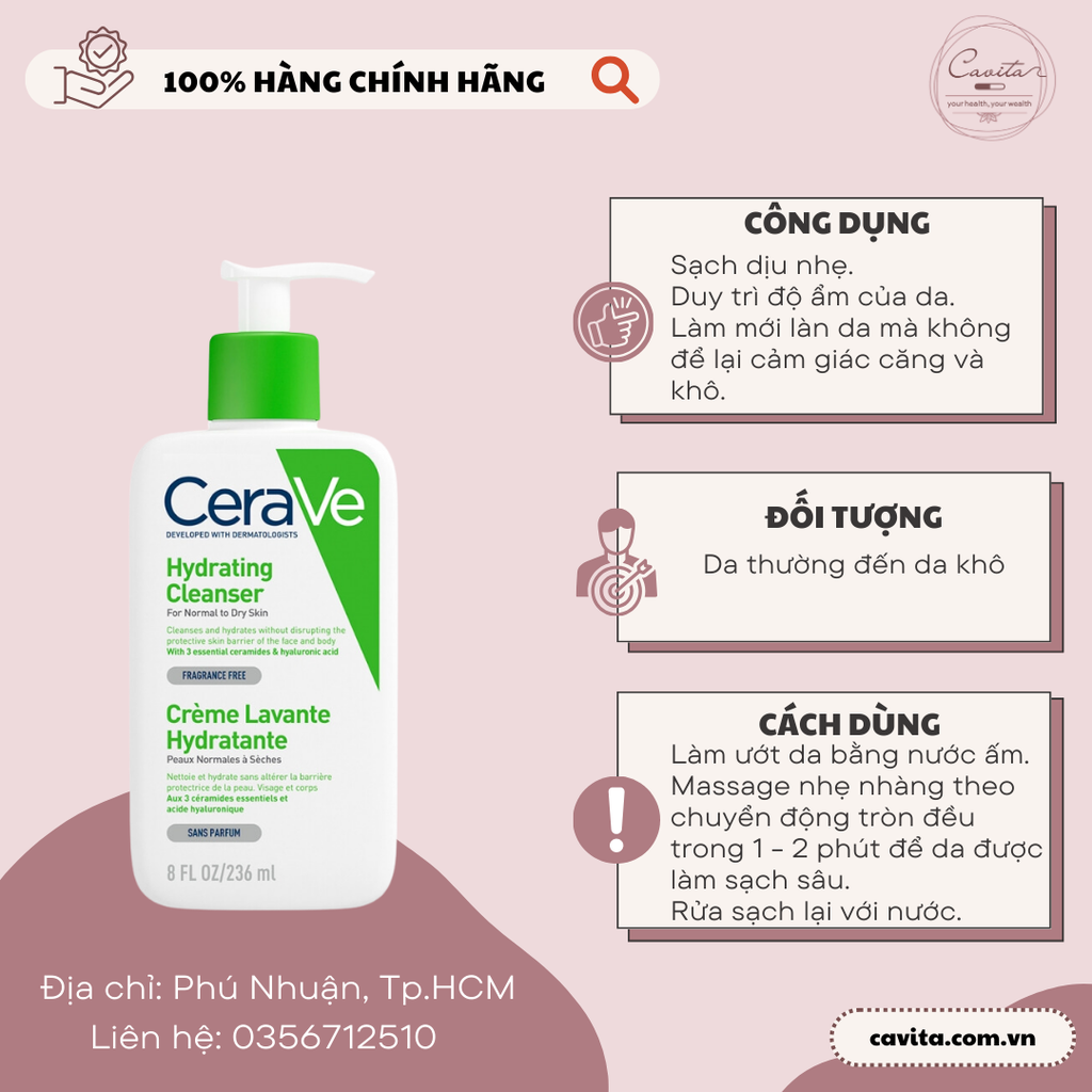 Sữa rửa mặt có thể loại bỏ bụi bẩn, lớp trang điểm, dầu thừa trên da, nhưng sữa rửa mặt dưỡng ẩm, như CeraVe Hydrating Facial Cleanser, có thể làm tất cả những điều đó mà không phá vỡ hàng rào bảo vệ tự nhiên của da hoặc làm mất đi độ ẩm tự nhiên của da. Được tạo ra bởi các bác sĩ da liễu, CeraVe Hydrating Facial Cleanser là sản phẩm rửa mặt dịu nhẹ, với các thành phần như Ceramides và Axit Hyaluronic có tác dụng khôi phục hàng rào tự nhiên của da để giúp da khóa ẩm.