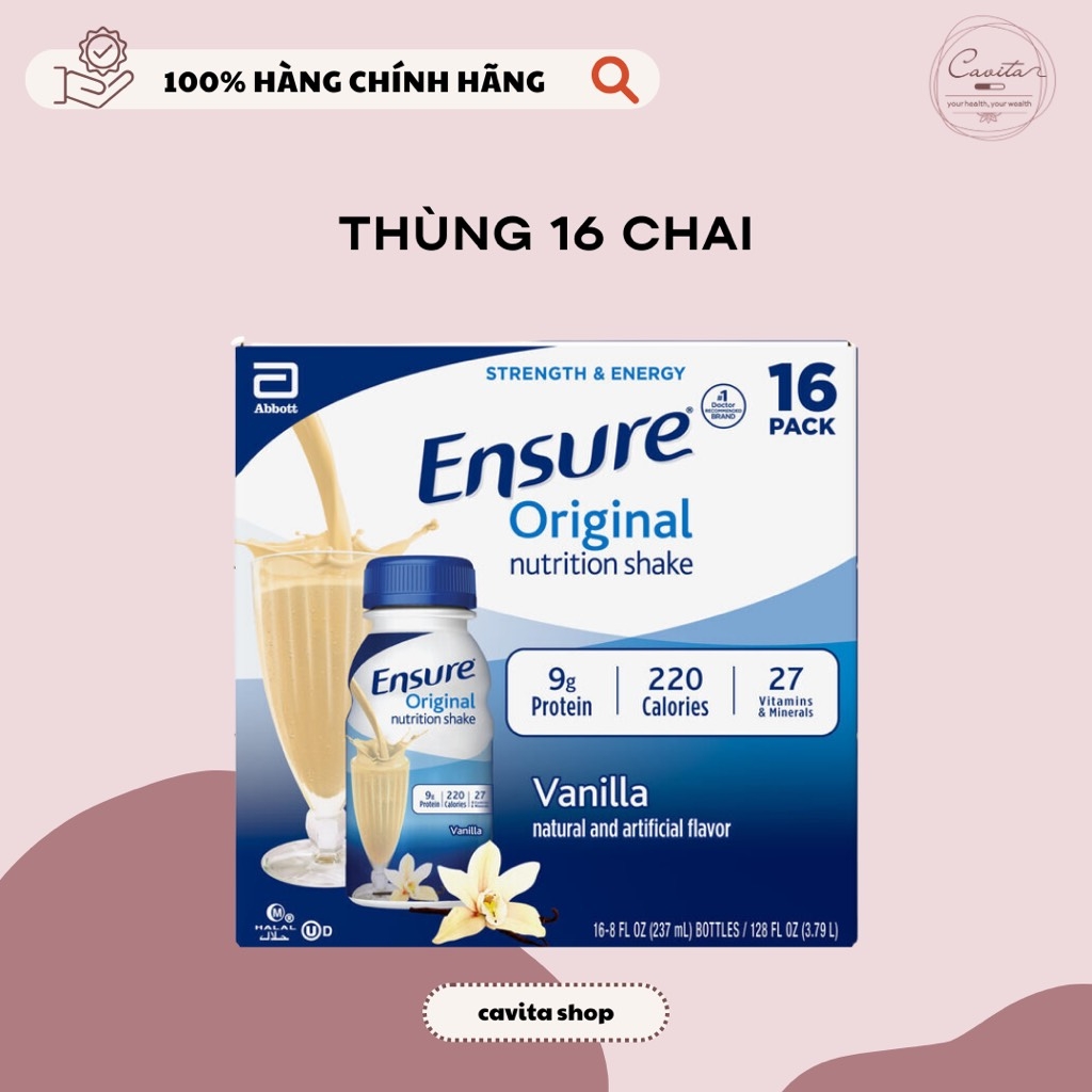 Mỗi chai đều Ensure Shake đều có 9 gram protein, 220 calo và 27 vitamin và khoáng chất thiết yếu. Bổ sung sữa nước Ensure Original cơ thể bạn nhanh hồi phục và như được tiếp thêm sức mạnh, nguồn năng lượng chỉ trong 2 tuần.