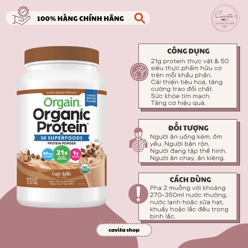 [ORGAIN] Bột bổ sung Protein vị Cà phê Latte 1.22kg - Plant Based Protein Powder